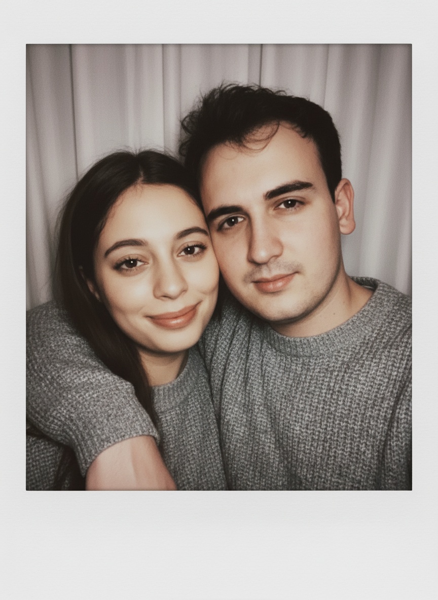 Prompt: Take a picture with a Polaroid camera. The photo should look like a normal photo, without any clear subject or props. The photo should have a slight blur and a consistent light source. Such as a flash from a dark room, spread throughout the photo. Do not change the faces. Replace the background behind the two people with a white curtain. (With the guy hugging girl) Change outfits with matching couple.