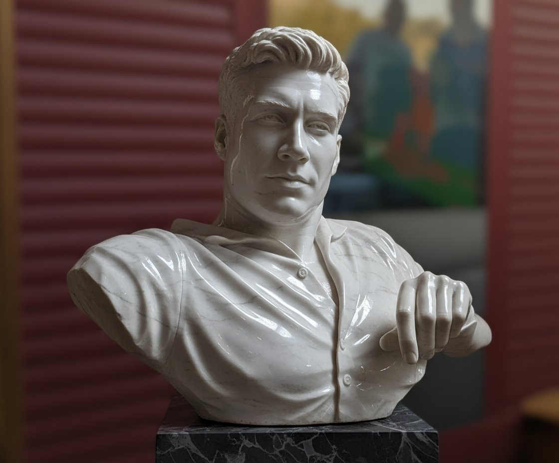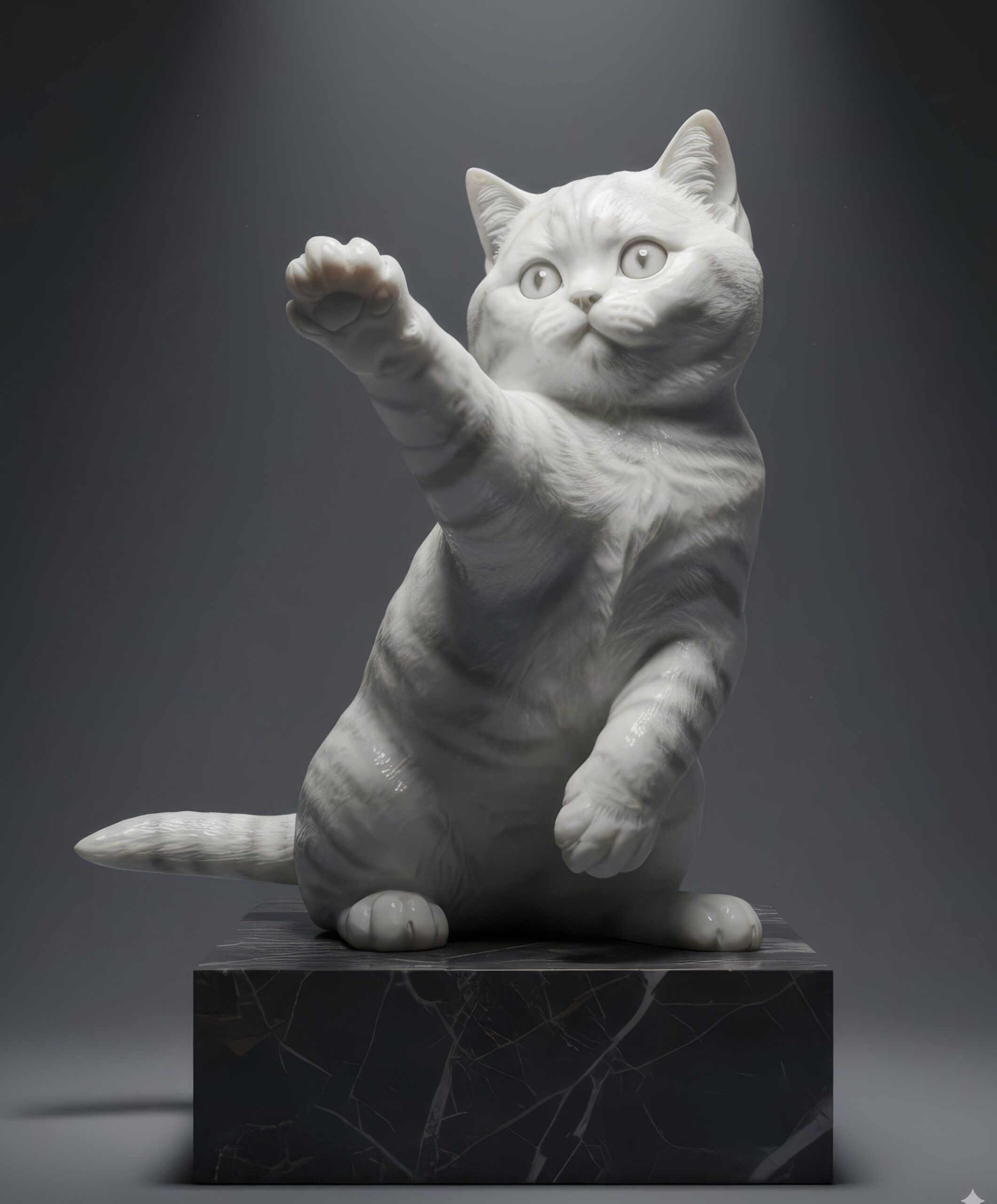 Prompt: A photorealistic image of an ultra-detailed sculpture of the subject in image made of shining marble. The sculpture should display smooth and reflective marble surface, emphasizing its luster and artistic craftsmanship. The design is elegant, highlighting the beauty and depth of marble. The lighting in the image should enhance the sculpture’s contours and textures, creating a visually stunning and mesmerizing effect.