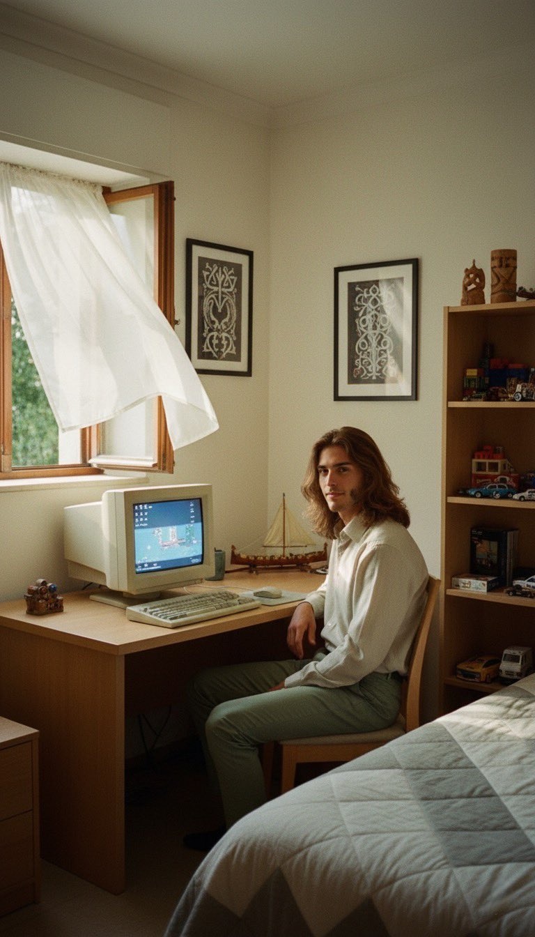 Prompt: Make a 1998 bedroom scene, a young teenager sitting at a corner desk with a CRT computer and beige keyboard, looking at the camera casually. Wearing jeans overall popular in the 1990s band printed image on it, some posters of “X Files” “I want to believe”, Backstreet Boys, NSYNC, hanging on the wall. The small window is open with a curtain blowing gently inward. The room has simple early 90s furniture. Shot on Kodak Gold 200 film, 35mm, with soft warm tones, slight grain, and authentic vintage texture. Captured like a family snapshot with a point-and-shoot camera, natural light coming through the window, nostalgic atmosphere.